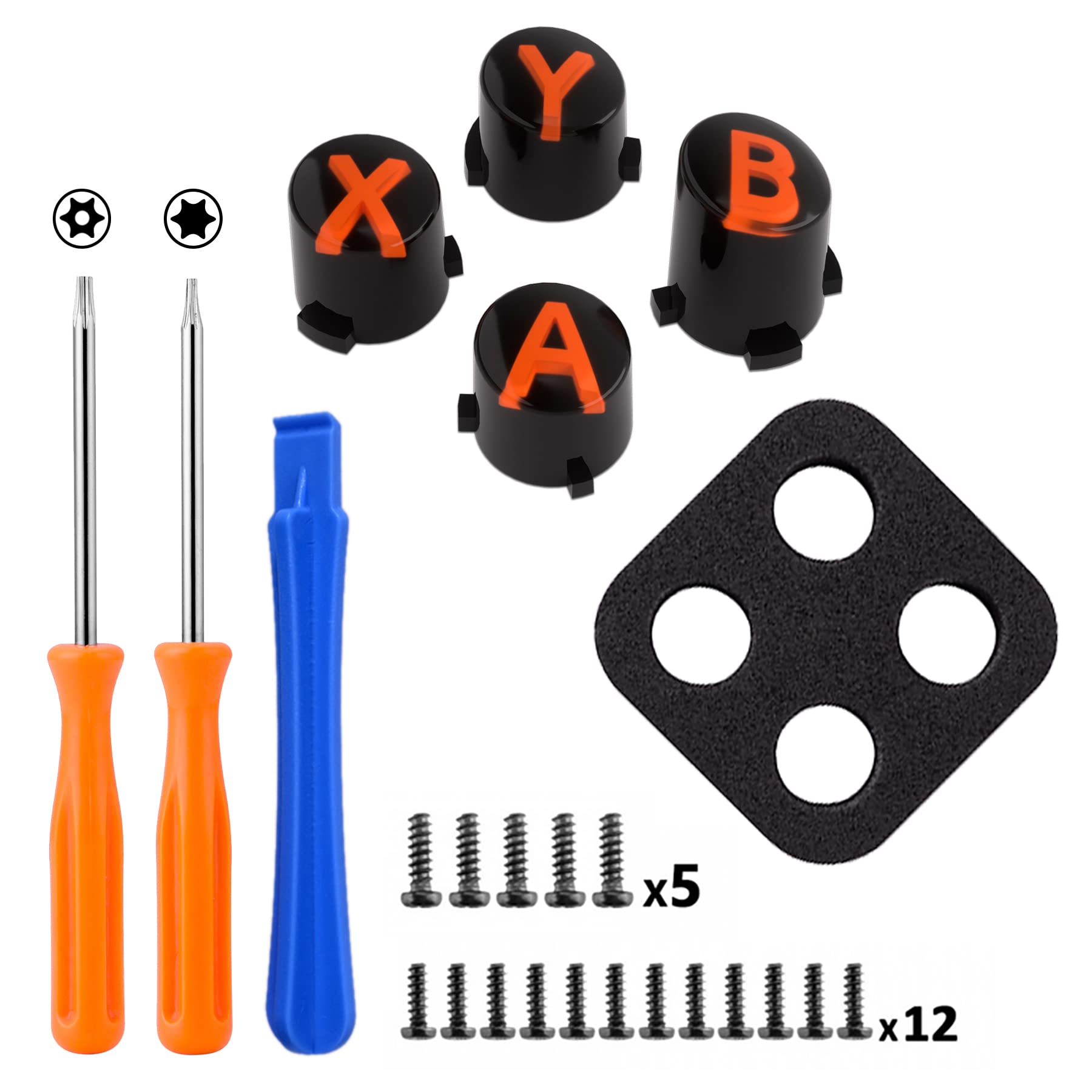 - Package includes: 1* ABXY buttons, 1* T8H screwdriver, 1* T6 screwdriver, 1* Open shell tool, and spare screws (The controller, dpad, thumbsticks and other buttons are not included.)