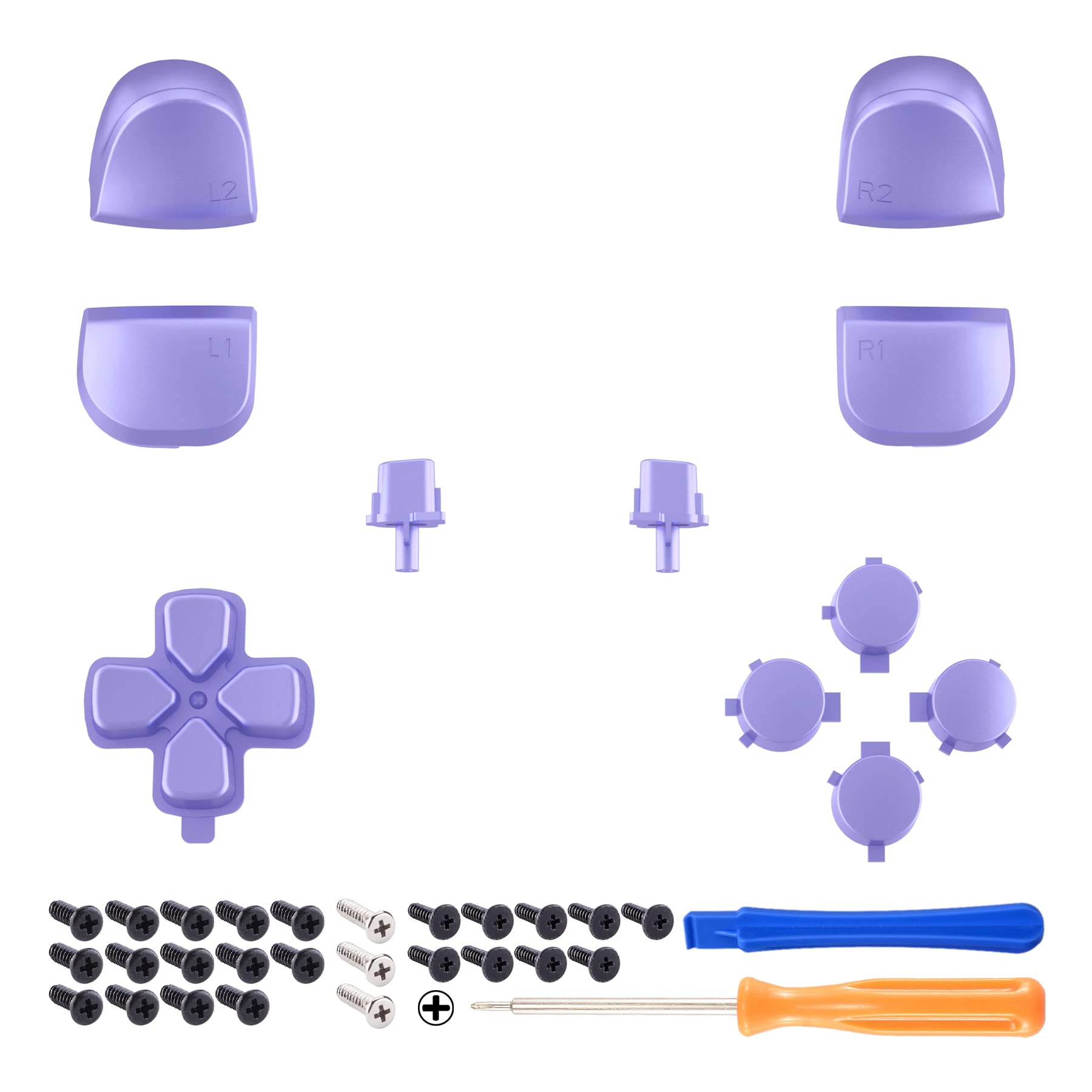 - Package includes: 1*Direction pad, 1* Action buttons set, 1* R1 L1 R2 L2 triggers, 1* Share Options buttons, 1* Cross screwdriver, 1* Open shell tool, and spare screws; Without the controller, thumbstick and any other parts