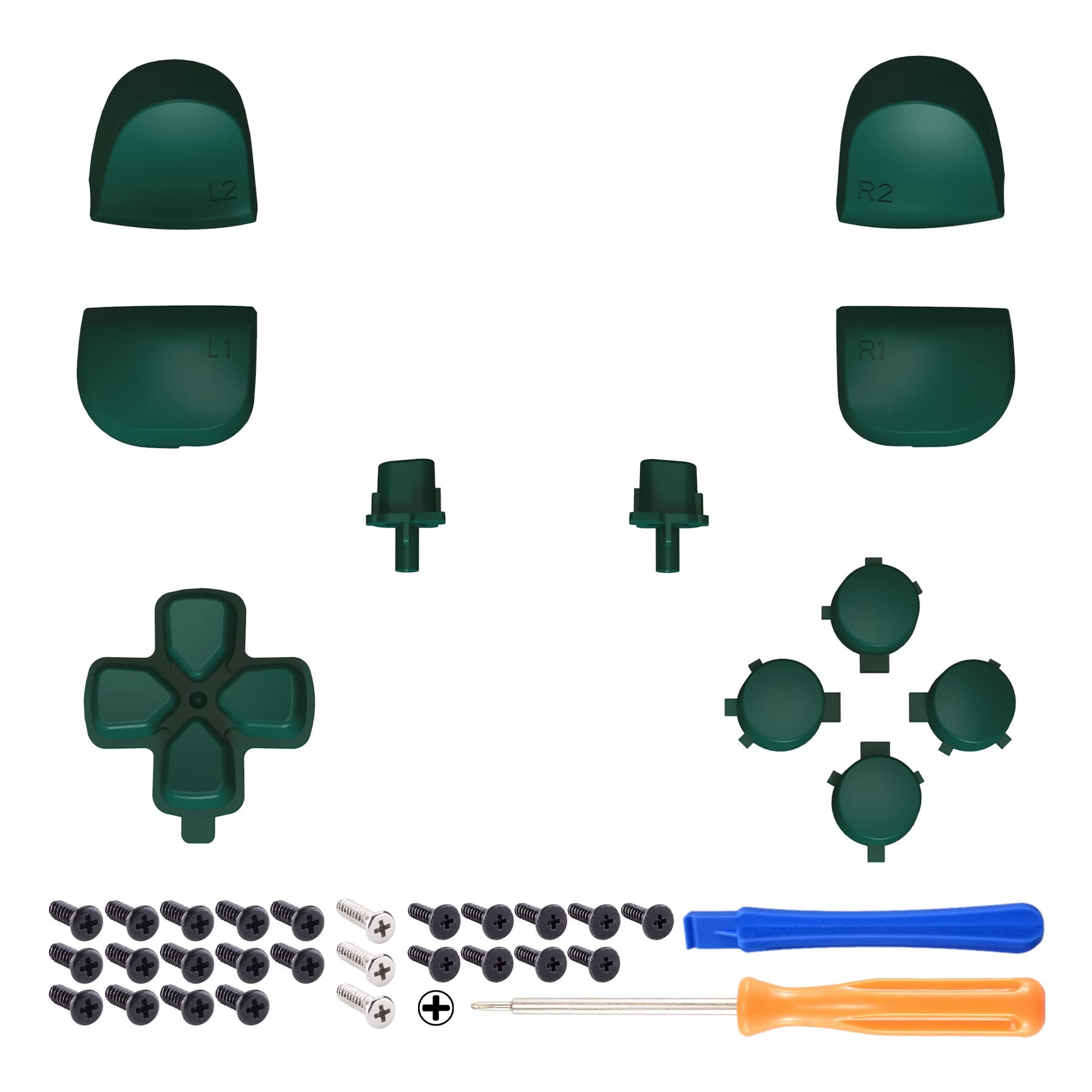 - Package includes: 1*Direction pad, 1* Action buttons set, 1* R1 L1 R2 L2 triggers, 1* Share Options buttons, 1* Cross screwdriver, 1* Open shell tool, and spare screws; Without the controller, thumbstick and any other parts