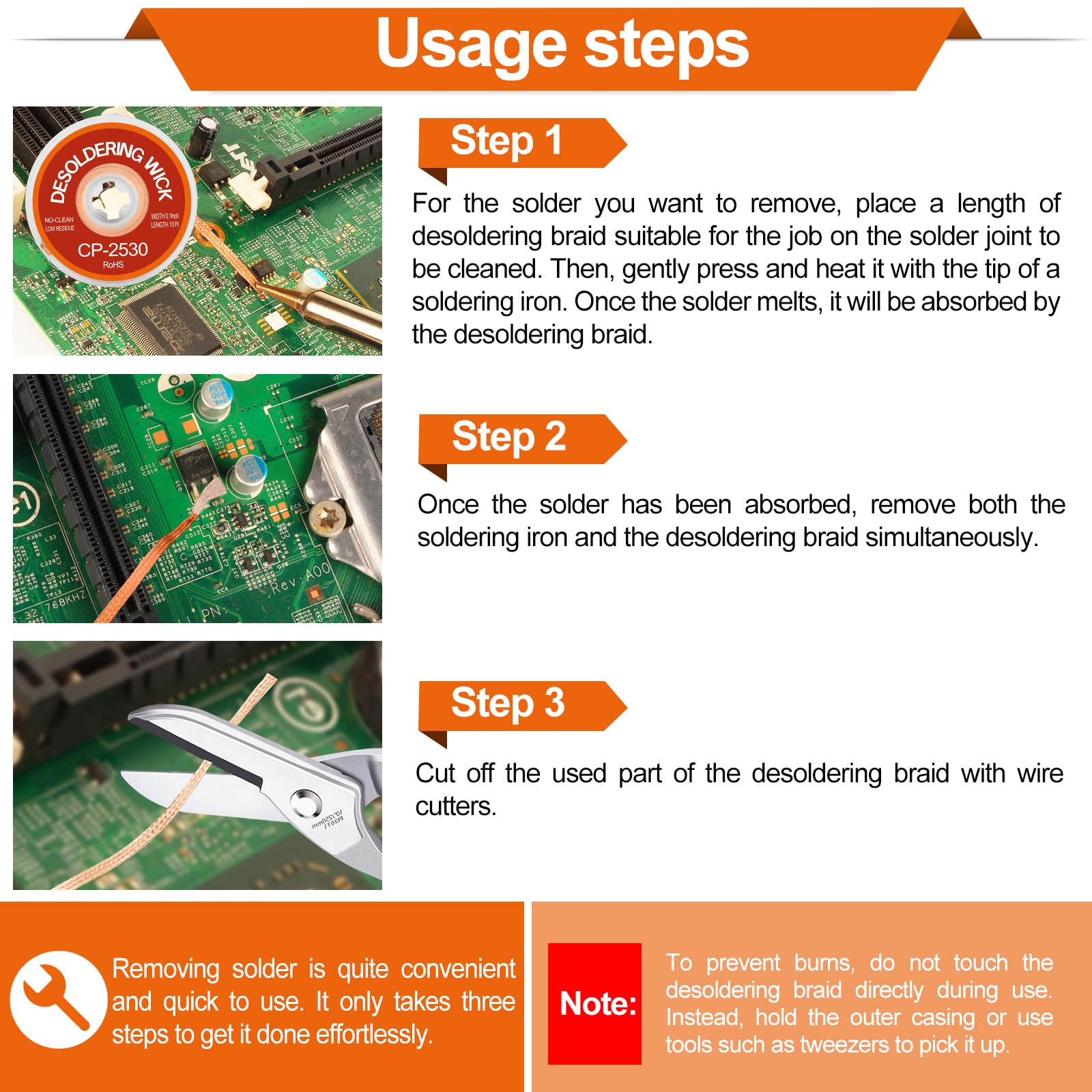 - Easy to Use: Simple operation. Place wick, apply heat, absorb solder. Gentle on small PCBs, avoid damage. Great for beginners and experienced users. Provide convenience and reliability