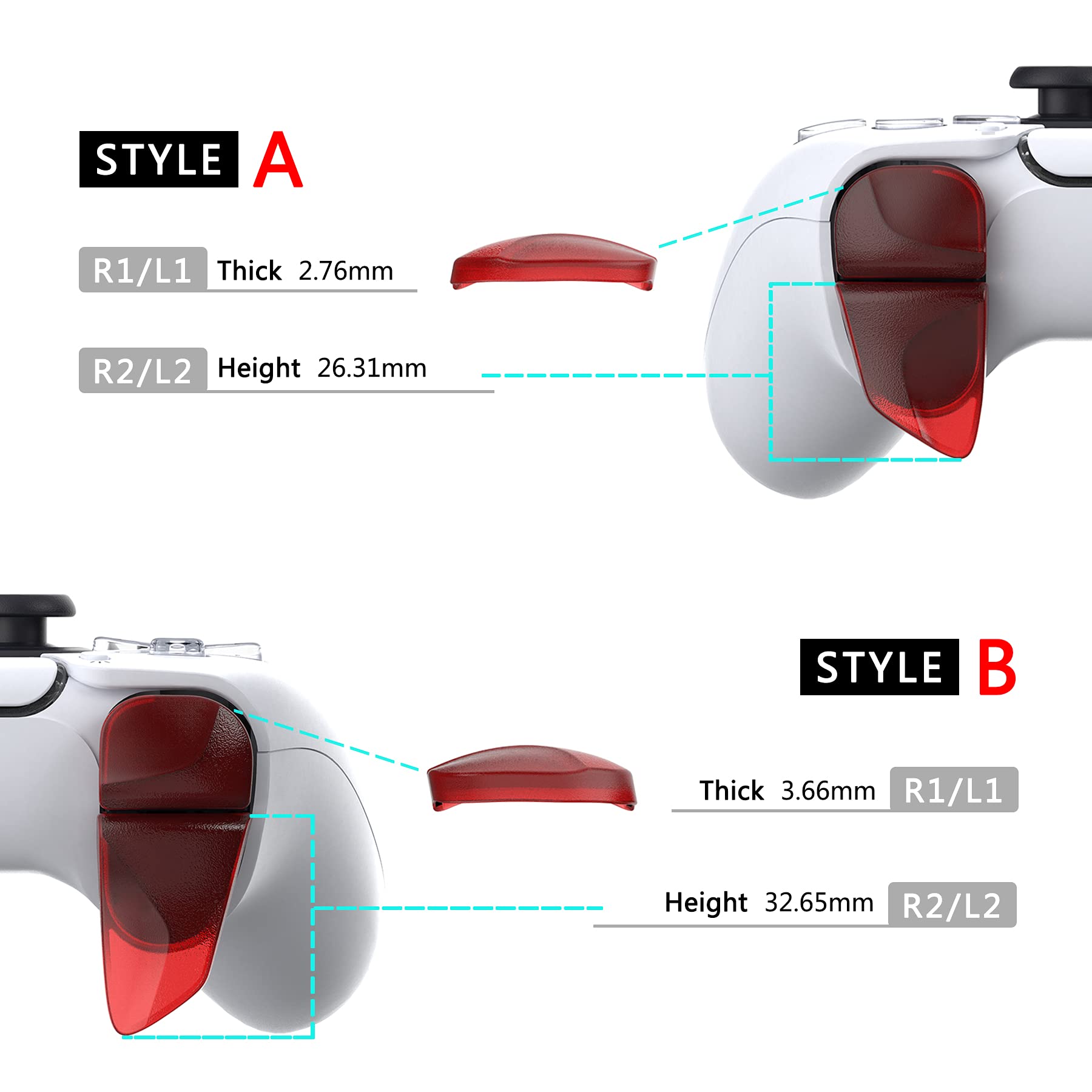 - Package include 2 pairs of L1R1 L2R2 bumpers and triggers extenders for ps5 controller, of which L1R1 extenders has two thicknesses, and L2R2 extenders have two length. You can choose the corresponding trigger adjuster according to your needs