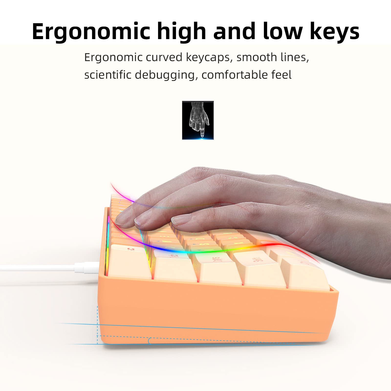 - 【RGB Light and Best Color】The 60% rgb keyboard include 6 backlight effects and 8 backlight color switching. It also provides transparent and transparent backlight as well as letters.Key cap close to skin color, harmony with people, stimulate the colorful world!